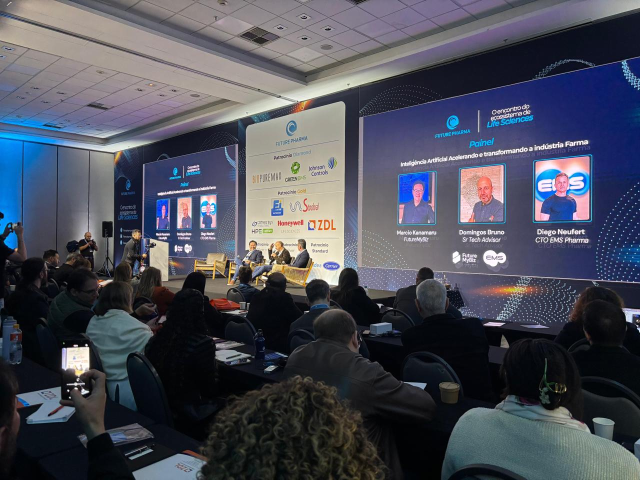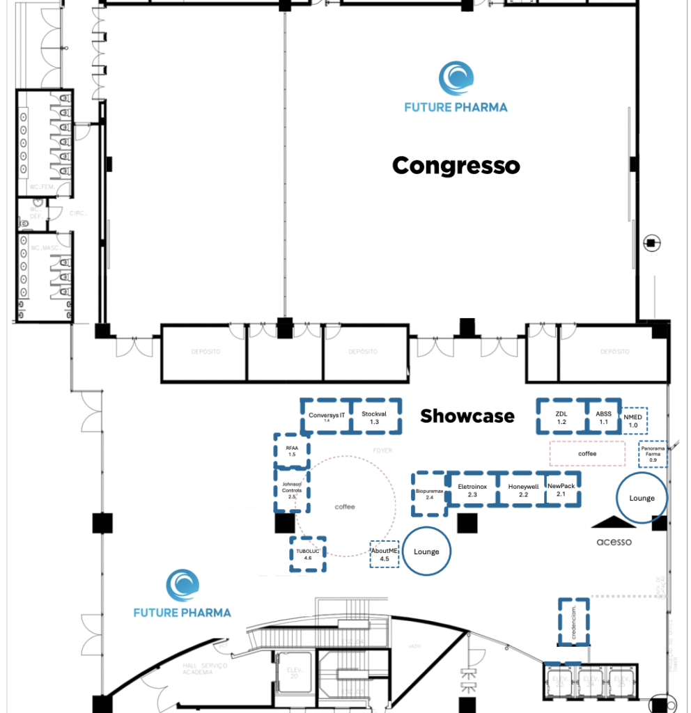 No Future Pharma, o conteúdo não é um fim — é o meio para gerar negócios. O evento combina congresso técnico e de gestão em duas salas simultâneas, com um showcase compacto de mini stands no foyer, no modelo americano de desks/popups.
