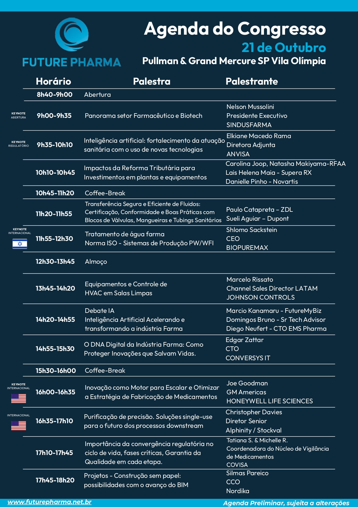 Ele irá usar toda sua bagagem, que incluiu formação em engenharia mecânica e 30 anos de experiências no projeto, instalação, validação e operação de sistemas de água para a indústria biofarmacêutica em todo o mundo, para trazer uma rica apresentação sobre os métodos, padrões e tecnologias mais recentes para a produção de Água para Injeção (WFI) de acordo com as especificações da USP-EP e a norma ISO 22519, com foco em eficiência energética, conformidade regulatória e sustentabilidade ♻